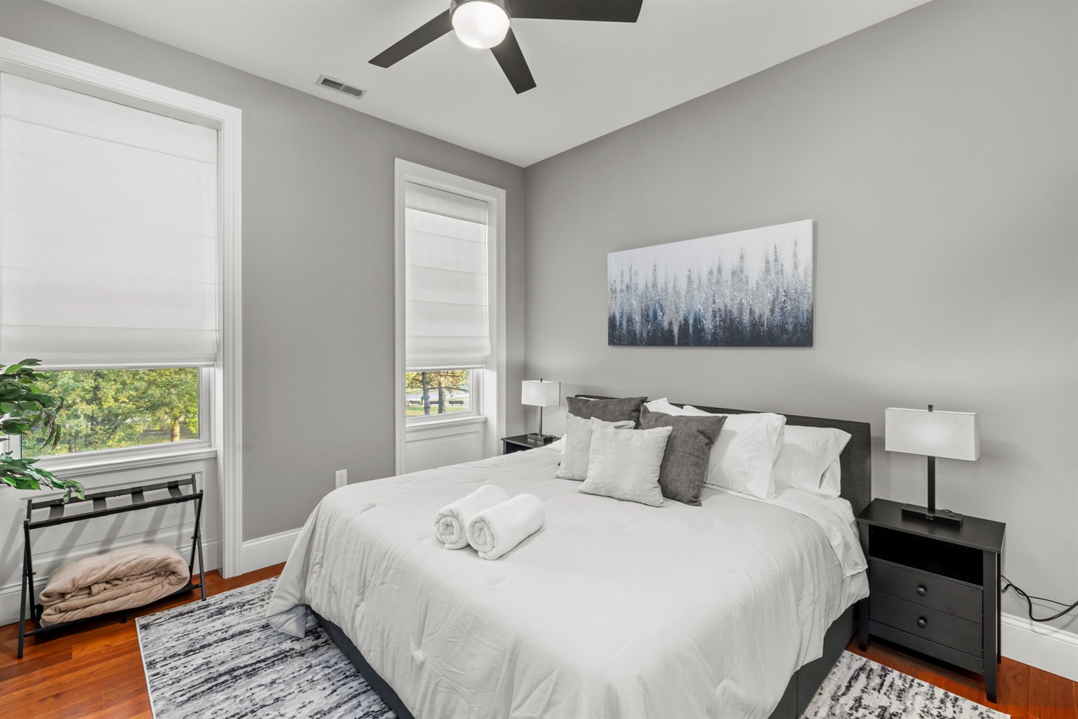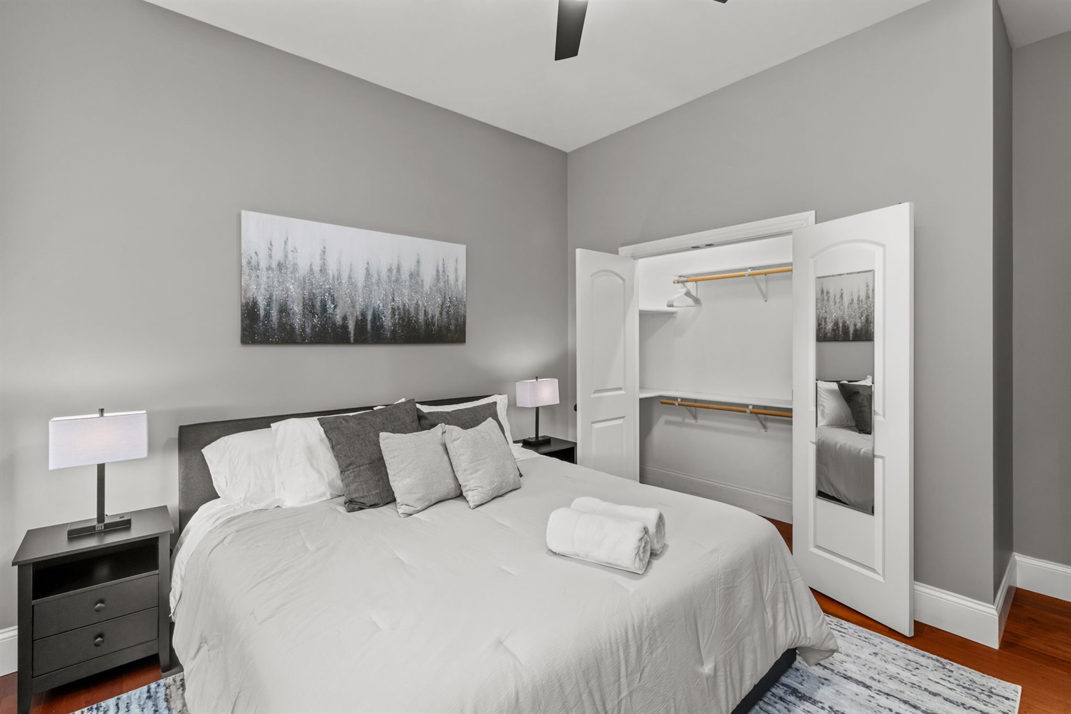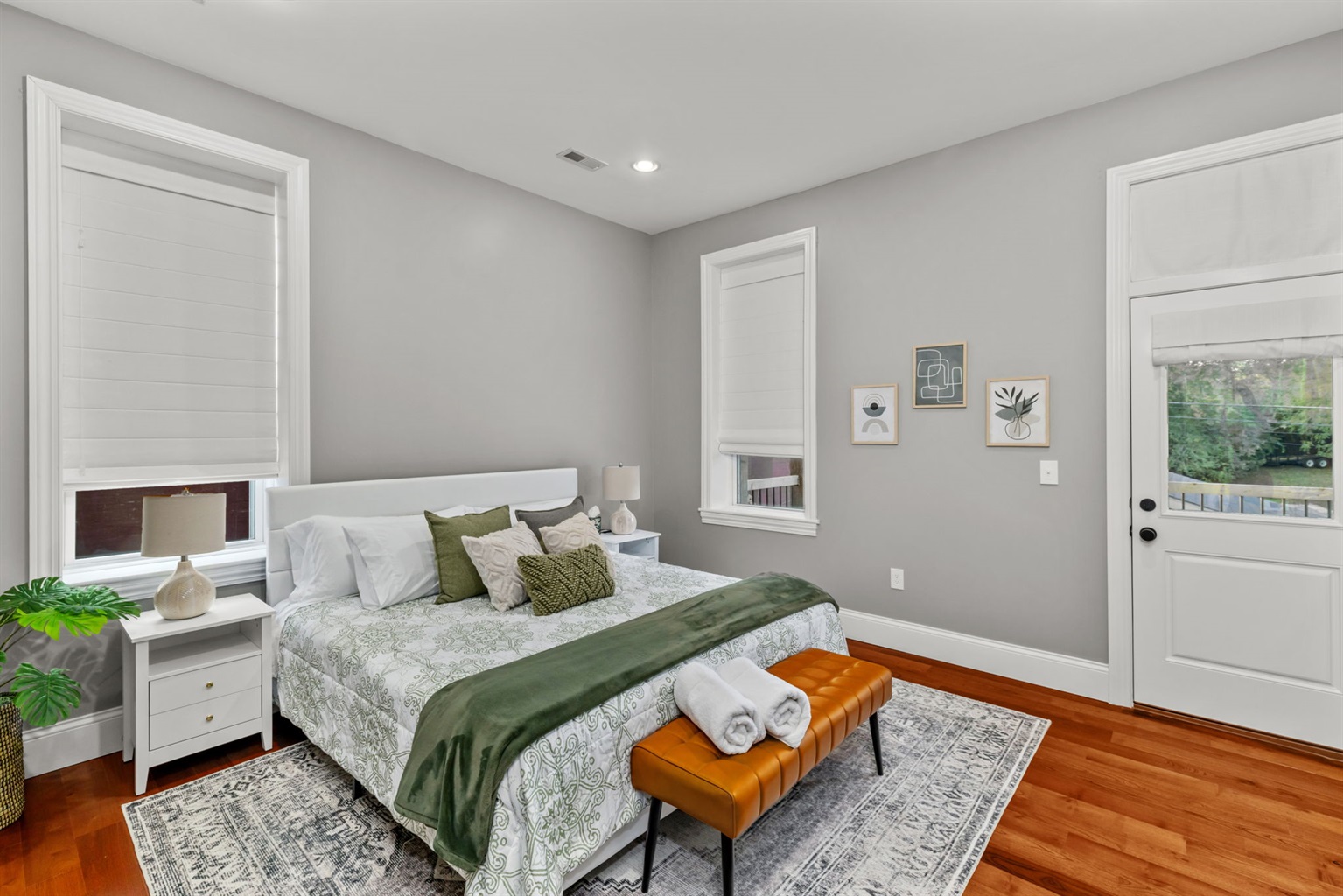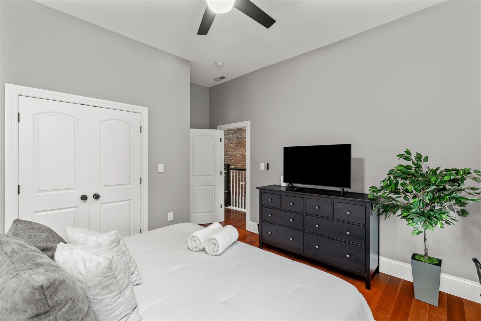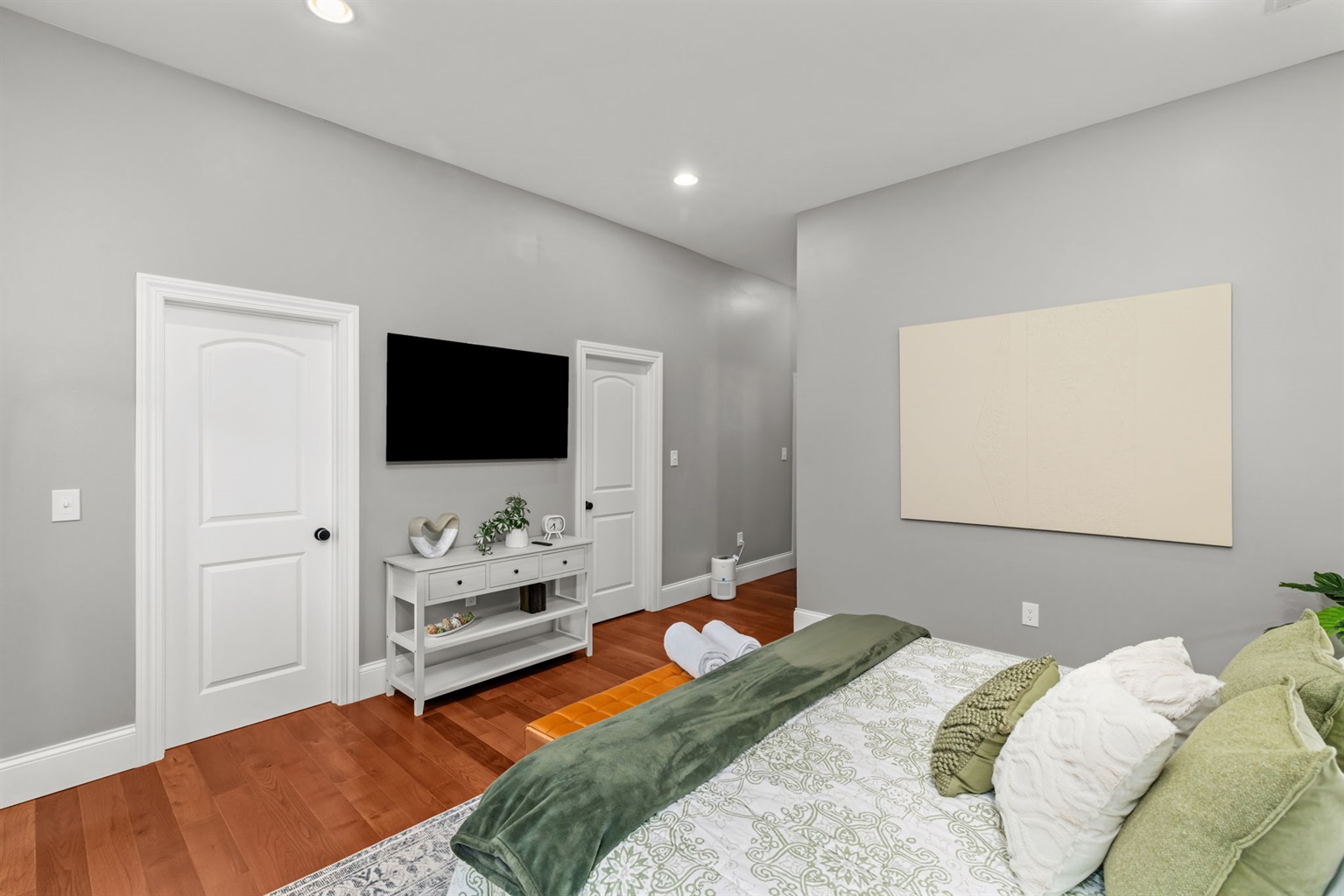 Bedroom 1 is bright and inviting with a king size bed, Smart TV, and spacious closet and dresser.