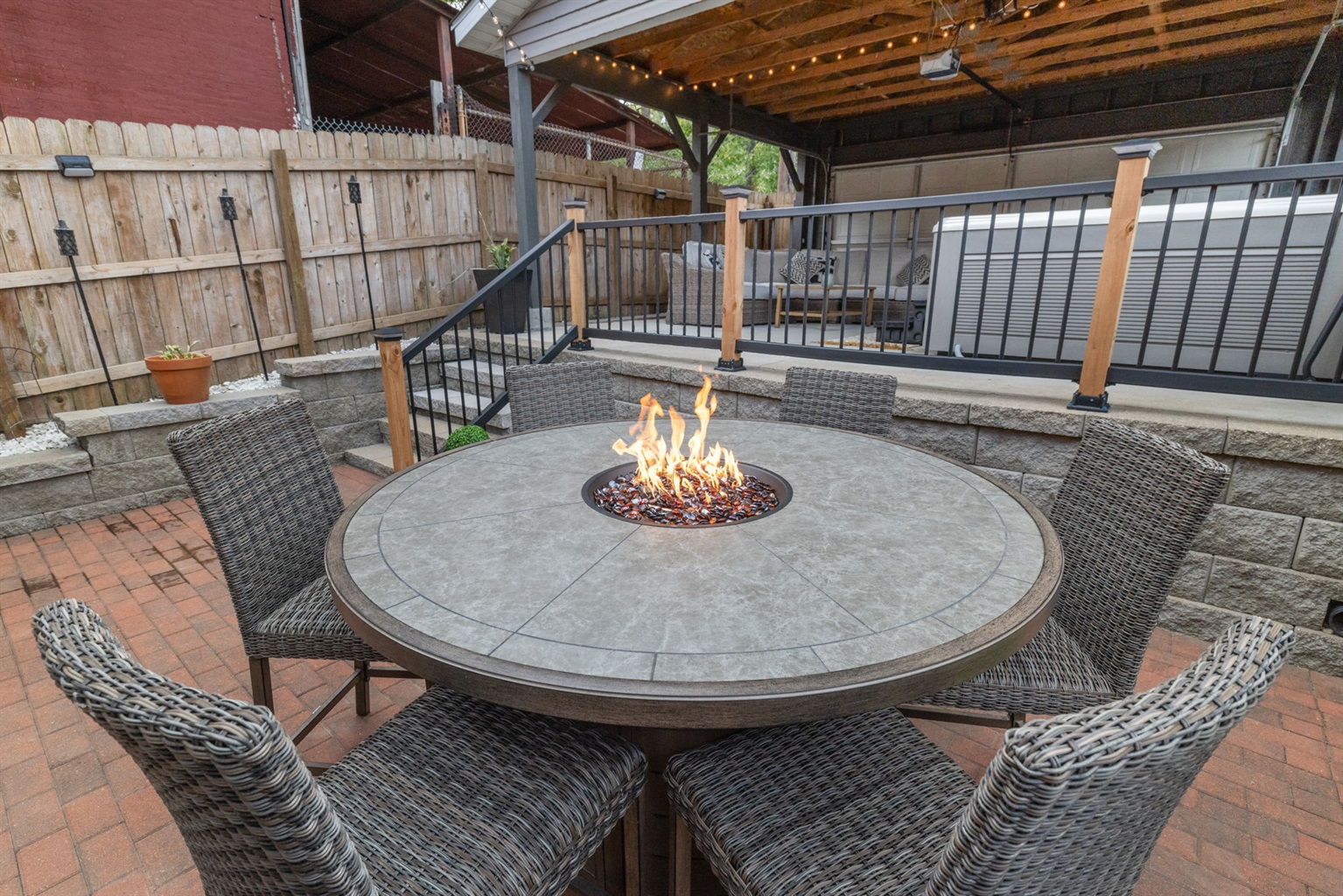 Share a meal around the outdoor dining table or gather round to keep warm with the center fire table feature.