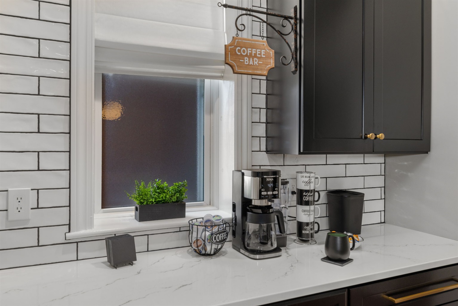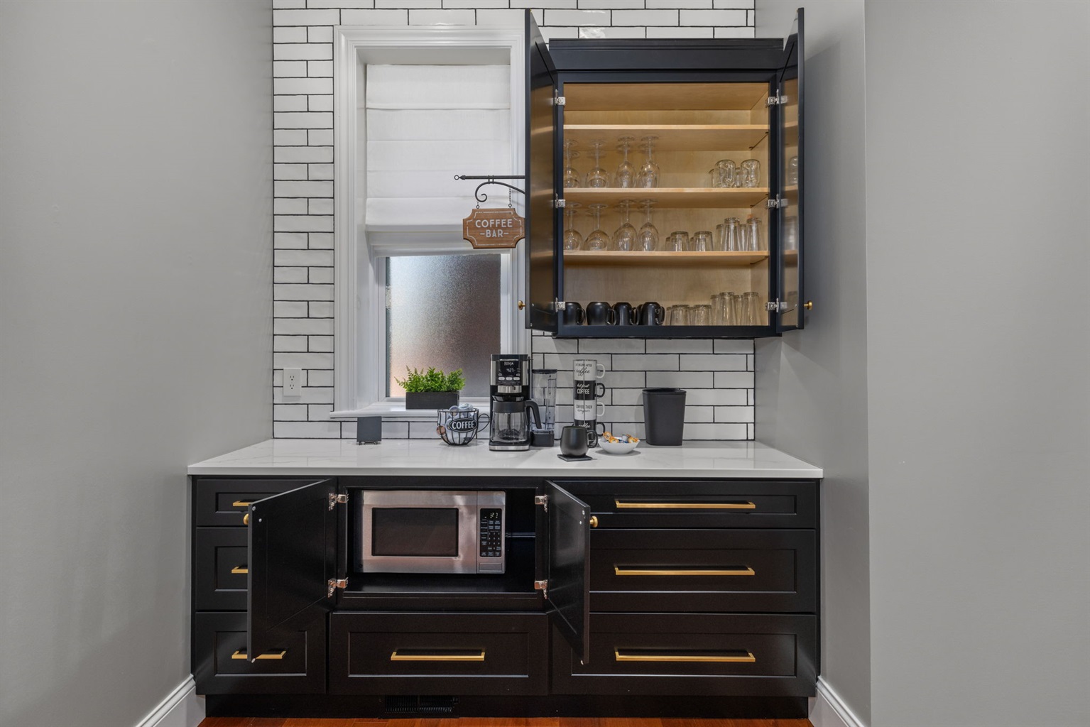 There are a variety of glasses and mugs for any particular need. Feel free to look around. Note the microwave is under the cabinet by the coffee bar!
