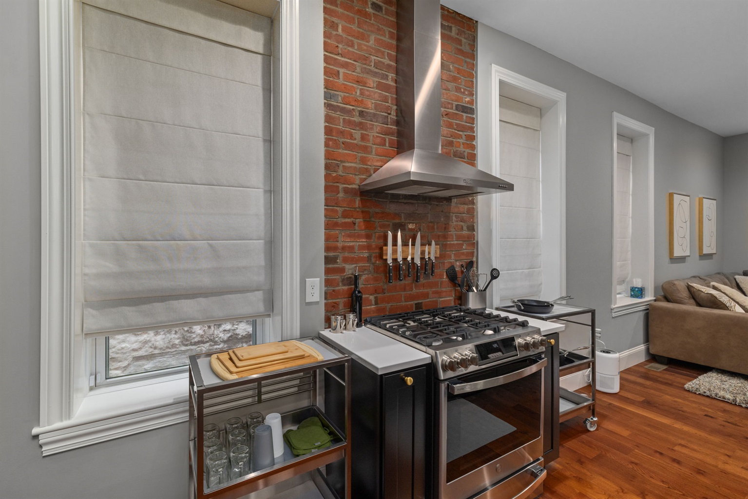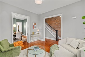 The front living room provides a comfy spot for a nice chat or reading a book. The fire place is decorative only.